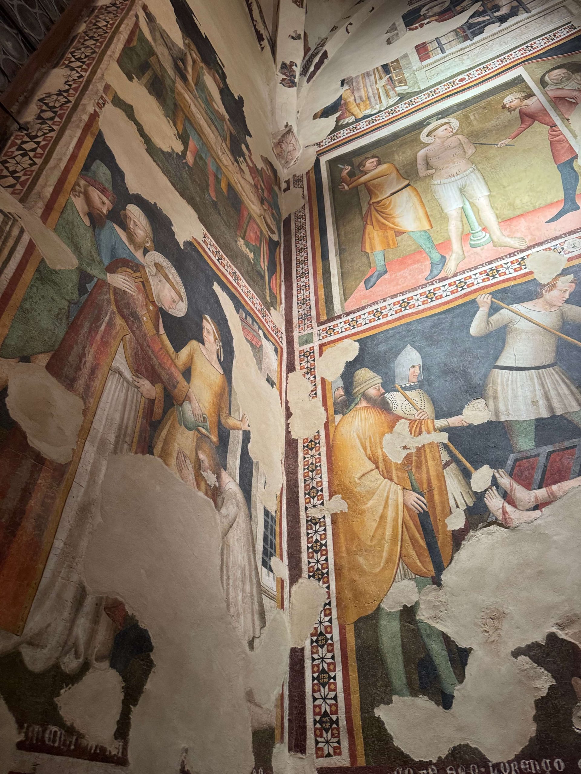 - Il ciclo trecentesco della Cappella di San Lorenzo – Qui l’artista Allegretto Nuzi, protagonista del Trecento umbro‑marchigiano, dipinge le Storie della vita del santo martire con grande acutezza narrativa e capacità di rendere gesti e dettagli visivi. Le scene raccontano episodi di carità, martirio e devozione, e mostrano l’influenza della pittura toscana dell’epoca, con attenzione particolare ai volumi, ai tessuti e alle espressioni umane.
